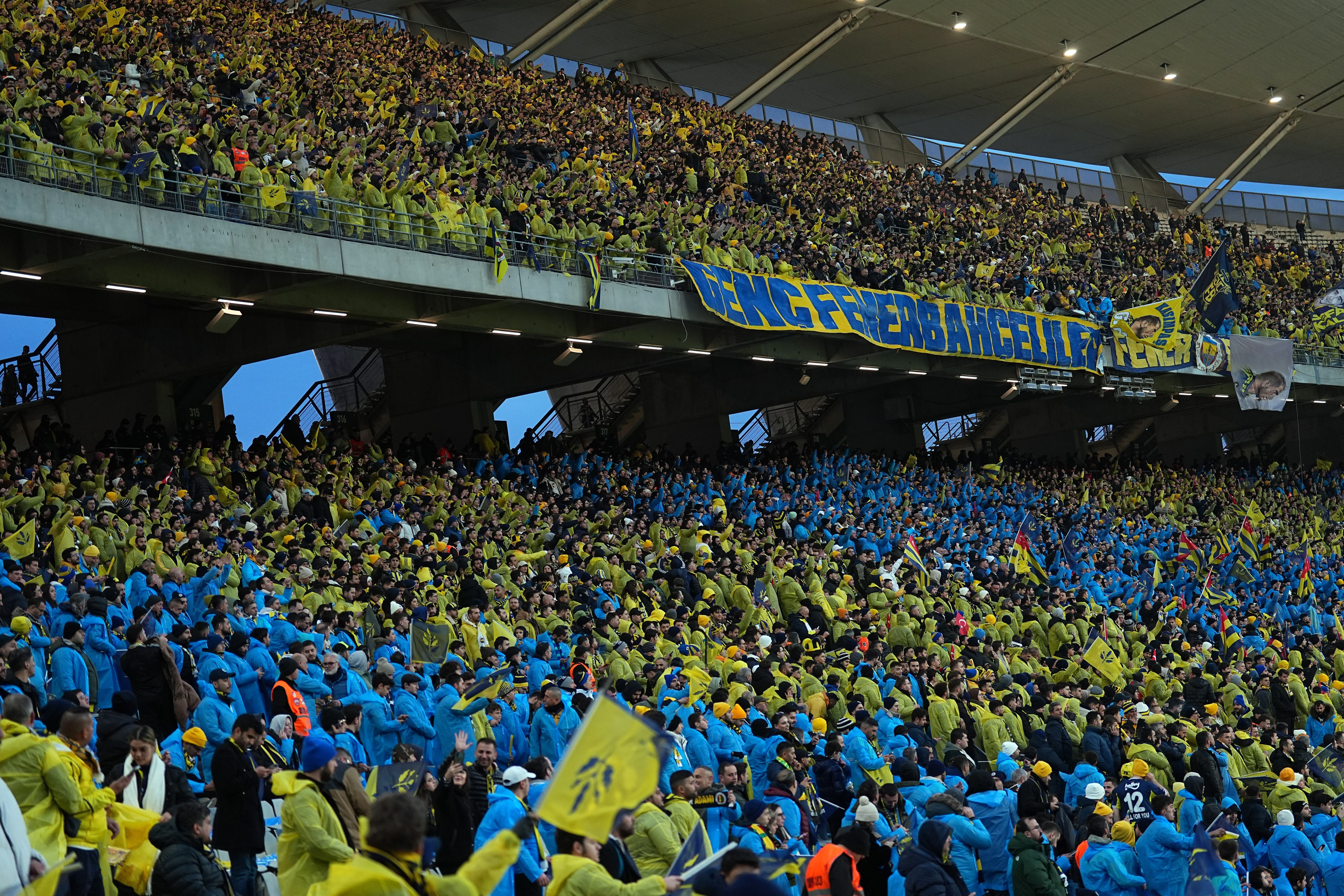 Fenerbahçeli taraftarlar, Üstün Kupa finalinde kendilerine ayrılan tribünleri büsbütün doldurdu. Yaklaşık 35 bin Fenerbahçe taraftarı, giydikleri sarı-lacivert yağmurluklar ve bayraklarla görsel şölen oluşturdu.